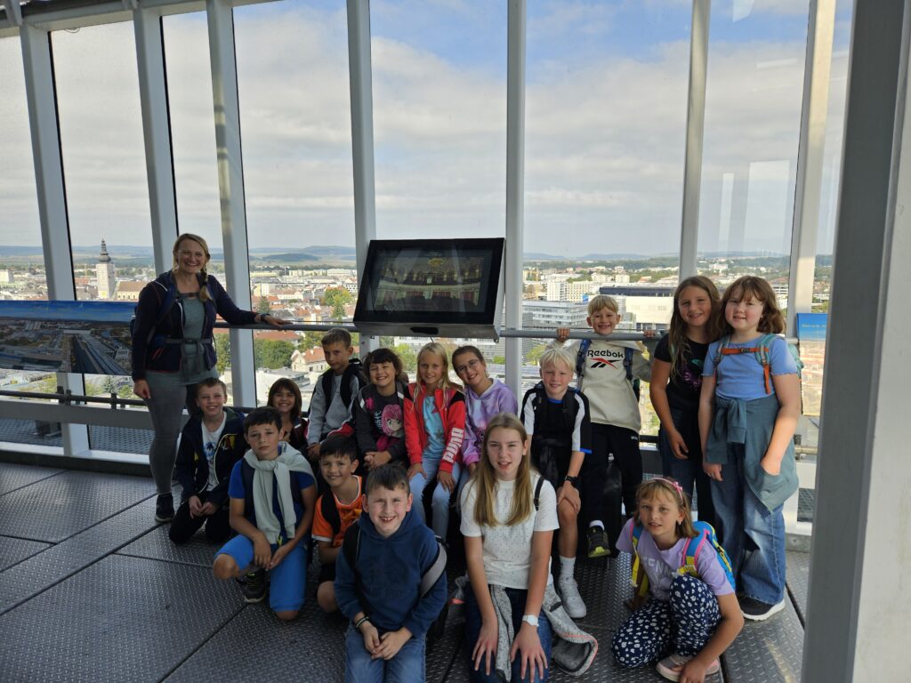 Im Rahmen der Aktion „Niederösterreichs Schülerinnen und Schüler lernen ihre Landeshauptstadt kennen“ fuhren die beiden 4. Klassen und eine ASO-Klasse am 22. September 2025 mit dem Bus nach St. Pölten. Zu Beginn unserer Tour besuchten wir die Altstadt. Dort schlenderten wir vorbei am Tellerhaus, an den „tratschenden Frauen“ und am Rathaus mit der Pestsäule. Sehr beeindruckend war der Besuch des Doms. Nach dem Mittagessen besichtigten wir den Klangturm und genossen den wunderschönen Ausblick über St. Pölten. Zum Schluss durften wir noch im Sitzungssaal des Landtags Platz nehmen. Dieser Tag schuf großartige Erinnerungen für Schüler und Lehrer.
