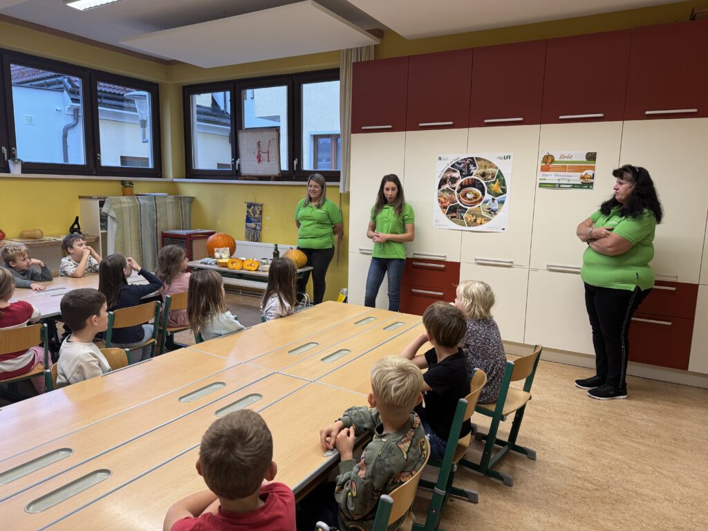 Am 15. Oktober drehte sich für die Schülerinnen und Schüler der ersten Klassen alles rund um den Kürbis. Drei Bäuerinnen vom Verein „Die Bäuerinnen“ besuchten uns in der Schule und brachten eine Fülle an spannenden Materialien und Köstlichkeiten mit. An verschiedenen Stationen erfuhren die Kinder allerlei Wissenswertes über den Kürbis – von seiner Herkunft über den Anbau bis hin zu seiner großen Sortenvielfalt. Auch gekostet wurde fleißig: Kürbiskernöl, Kürbiskerne, eine warme Kürbissuppe, Kürbiskuchen, Kürbismarmelade und Kürbissalat standen zur Verkostung bereit. Dabei entdeckten einige Kinder sogar die ein oder andere neue Lieblingsspeise. Zum Abschluss wurde noch kreativ gearbeitet: Jedes Kind durfte seinen eigenen Zierkürbis gestalten, der nun als herbstliche Dekoration die Zuhause der Kinder schmückt.
